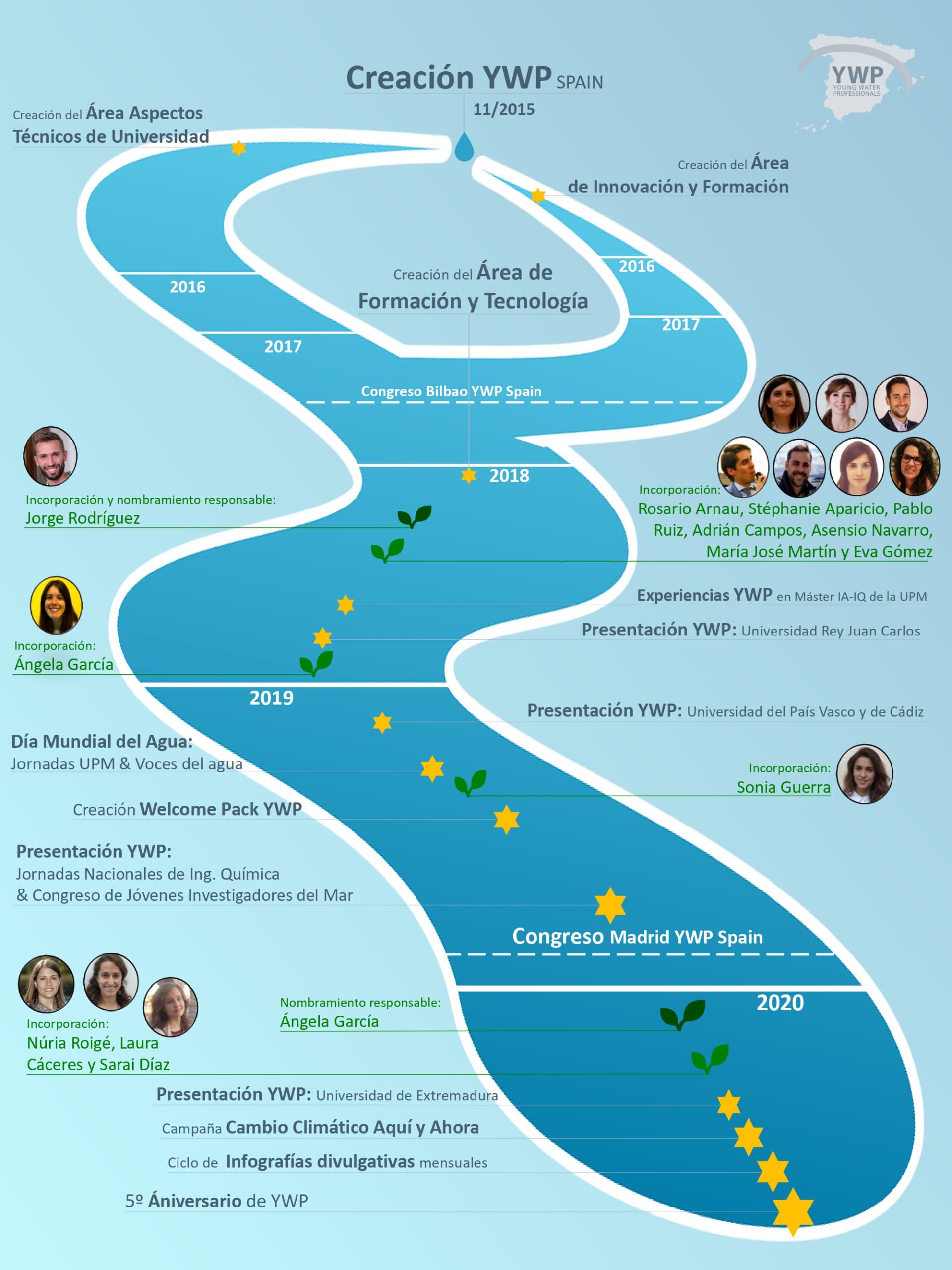 A principios de 2020, Ángela García fue nombrada responsable del área y se incorporaron al área Núria Roigé, Laura Cáceres y Sarai Díaz. Núria comenta que «yo conocí YWP en un congreso organizado por el IWA en Filipinas, allí participé en distintas actividades organizadas para los más jóvenes del país. En ese momento me pregunté si existiría una organización similar en España y unos meses más tarde en una jornada técnica del AEAS conocí a Andrés Guerra-Librero quien me animó a unirme al grupo». Sarai conoció YWP a través de Quintilia López, que se puso en contacto con la Escuela de Caminos de Ciudad Real cuando se estaba organizando el congreso de Bilbao «y allá que nos fuimos, un grupo de 15 alumnos y varios profesores, ¡menudo descubrimiento!». Laura recuerda que conoció a YWP justo antes del congreso YWP Spain 2019. «Buceando por la red conocí a YWP, pero no llegué a tiempo para inscribirme al Congreso. La verdad es que me dio mucha pena porque el programa era súper completo y descubrí que el sector del agua está compuesto de numerosos perfiles de los que no había oído hablar. Poco después contacté con Eratsi que me contó un poquillo más de la organización y no dudé en unirme. Poco después de mi primer contacto con los componentes del chapter en una sesión en las oficinas de YWP en Madrid, apareció el anuncio de Ángela solicitando miembros para el equipo de formación. El no tener un perfil de investigadora universitaria no fue para nada un problema para aportar mi granito de arena al grupo desde el punto de vista de la empresa».